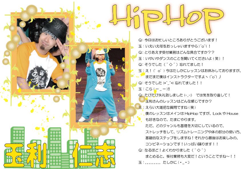 ダンス初心者の方向けのヒップホップクラス。大阪市の初心者が楽しむスタジオダンシングシティの玉利仁志のページになります。