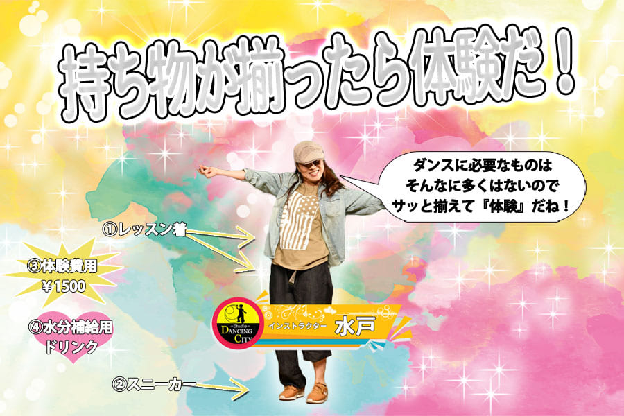 レッスンシューズと体験費用が必要。